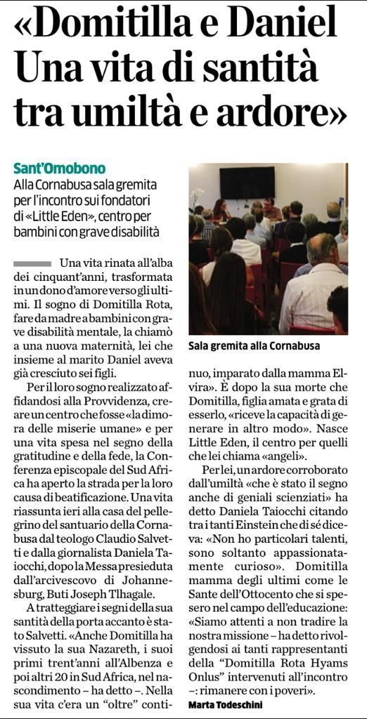 Per il loro sogno realizzato affidandosi alla Provvidenza, creare un centro che fosse « la dimora delle miserie umane» e per una vita spesa nel segno della gratitudine e della fede, la Conferenza episcopale del Sud Africa ha aperto la strada per la loro causa di beatificazione. Una vita riassunta ieri alla casa del pellegrino del santuario della Comabusa dal teologo Claudio Salvetti e dalla giornalista Daniela Taiocchi, dopo la Messa presieduta dall’arcivescovo di Johannesburg, Buti Joseph Tlhagale.